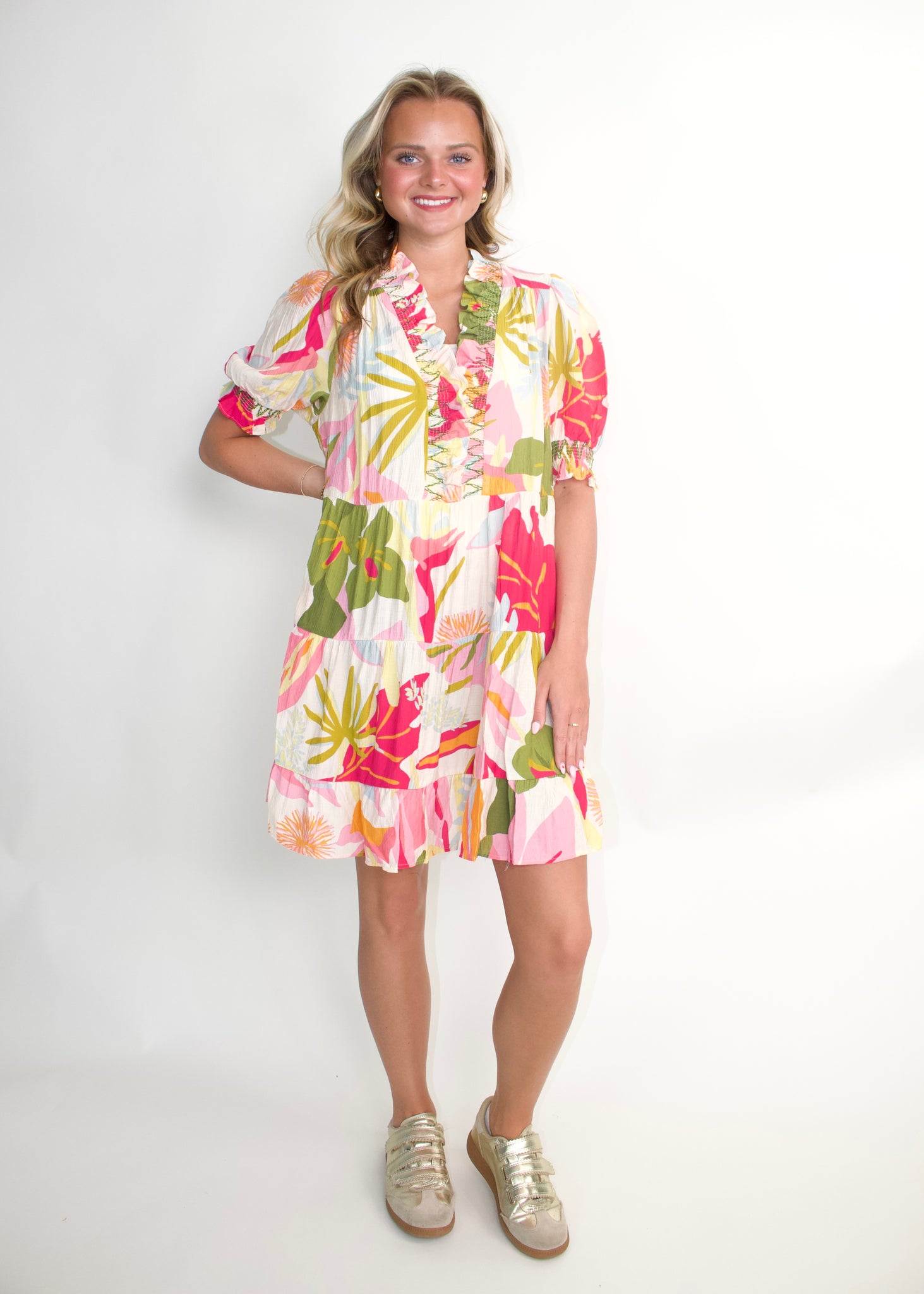 This dress features a vibrant tropical patchwork print with a mix of florals and leafy details throughout. Designed with a flattering V neckline trimmed in soft ruffles and short puff sleeves with elastic for an easy, comfortable fit. The empire waist seam creates a flowy, feminine shape, while the slightly crinkled fabric adds texture and keeps it effortless and low-maintenance. A perfect throw-on dress that still feels special.