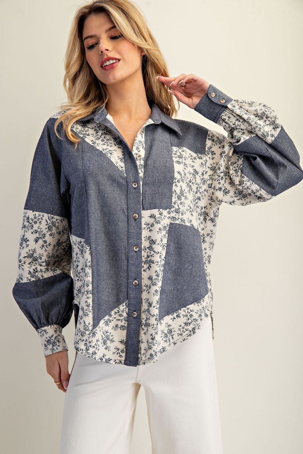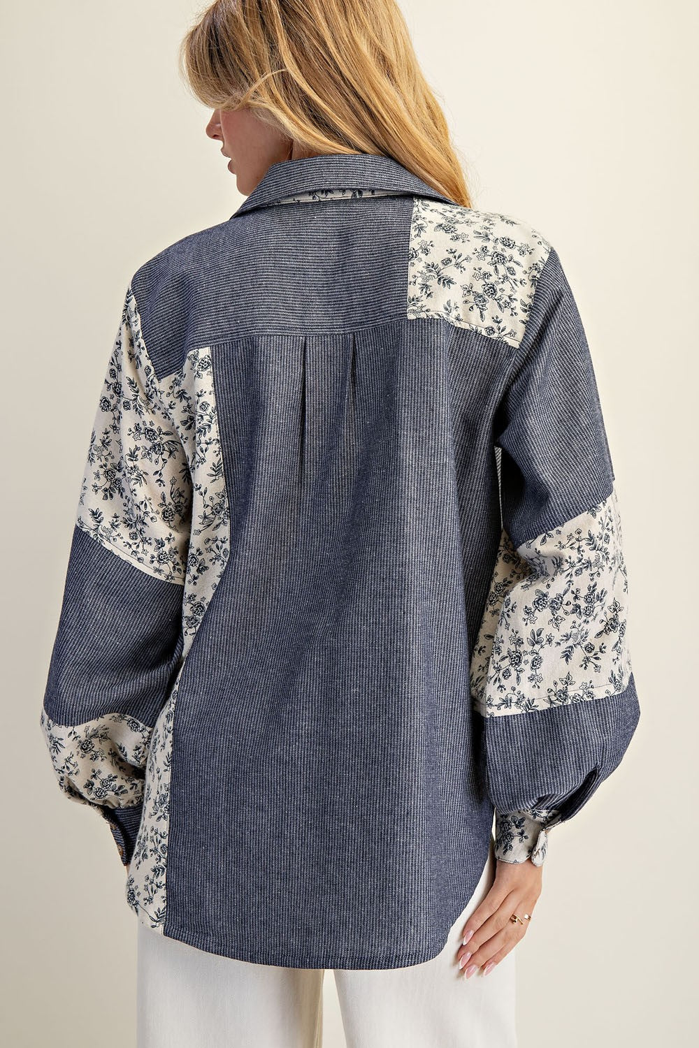 - Mixed Panels of Striped Denim and Floral Print