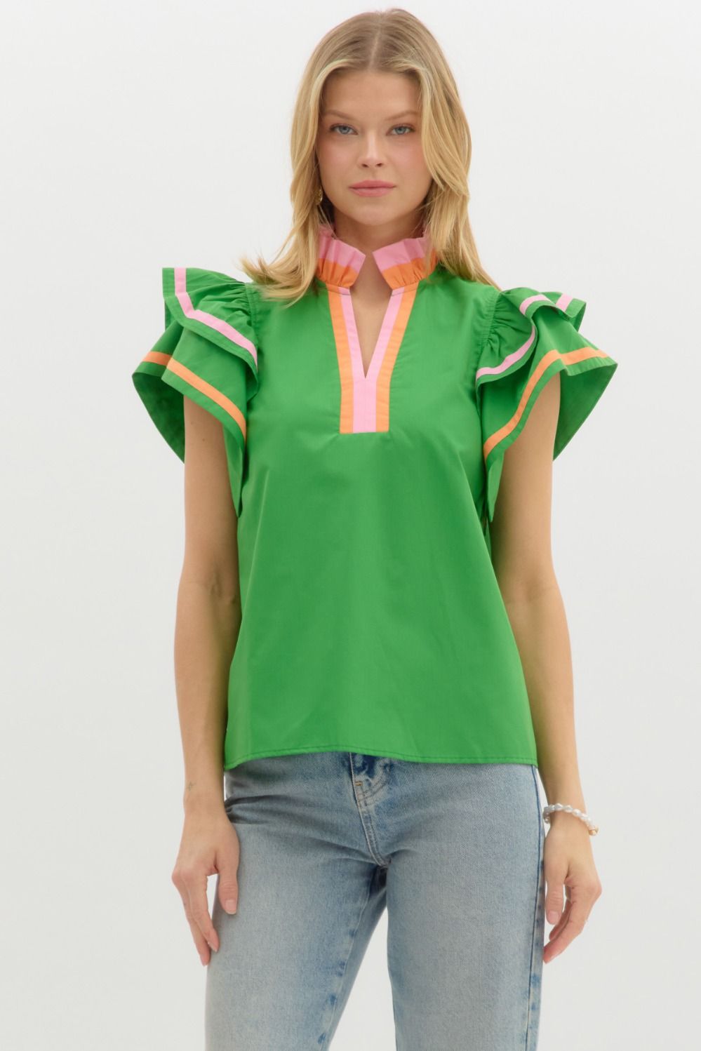 Entro Solid Color Top with Multi Color Stripe Details in Green