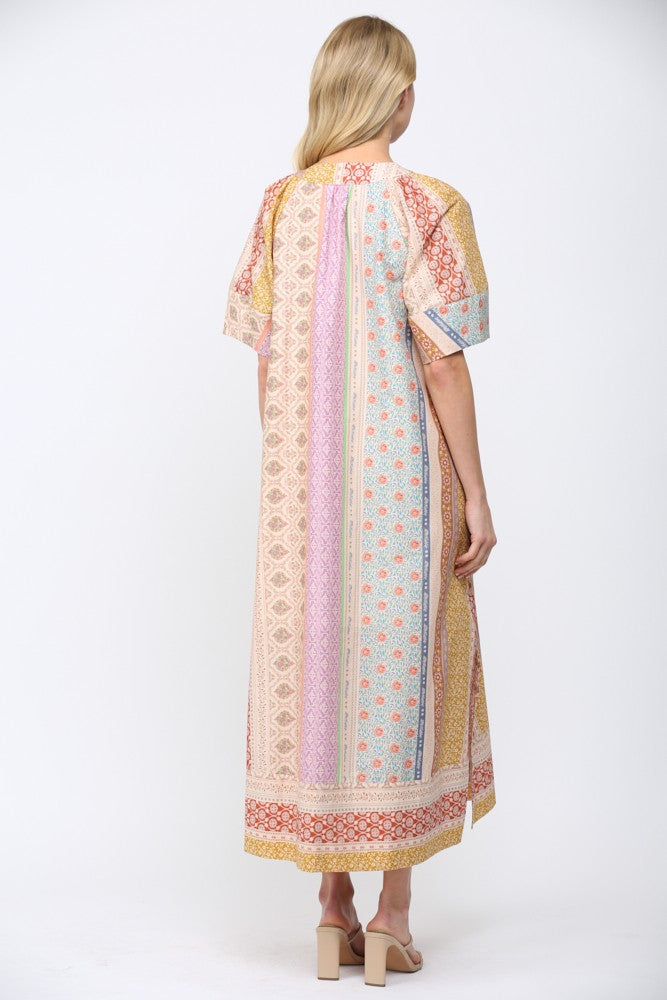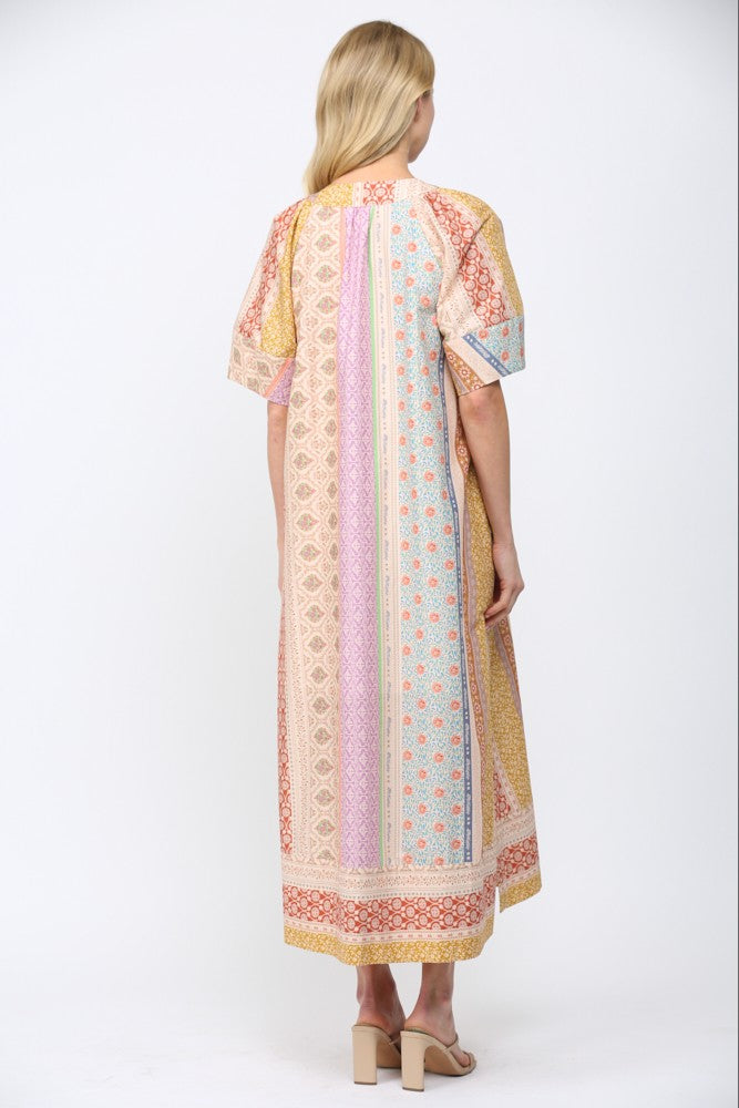 FATE Mixed Patchwork Print Kaftan Style Dress in Beige Multi