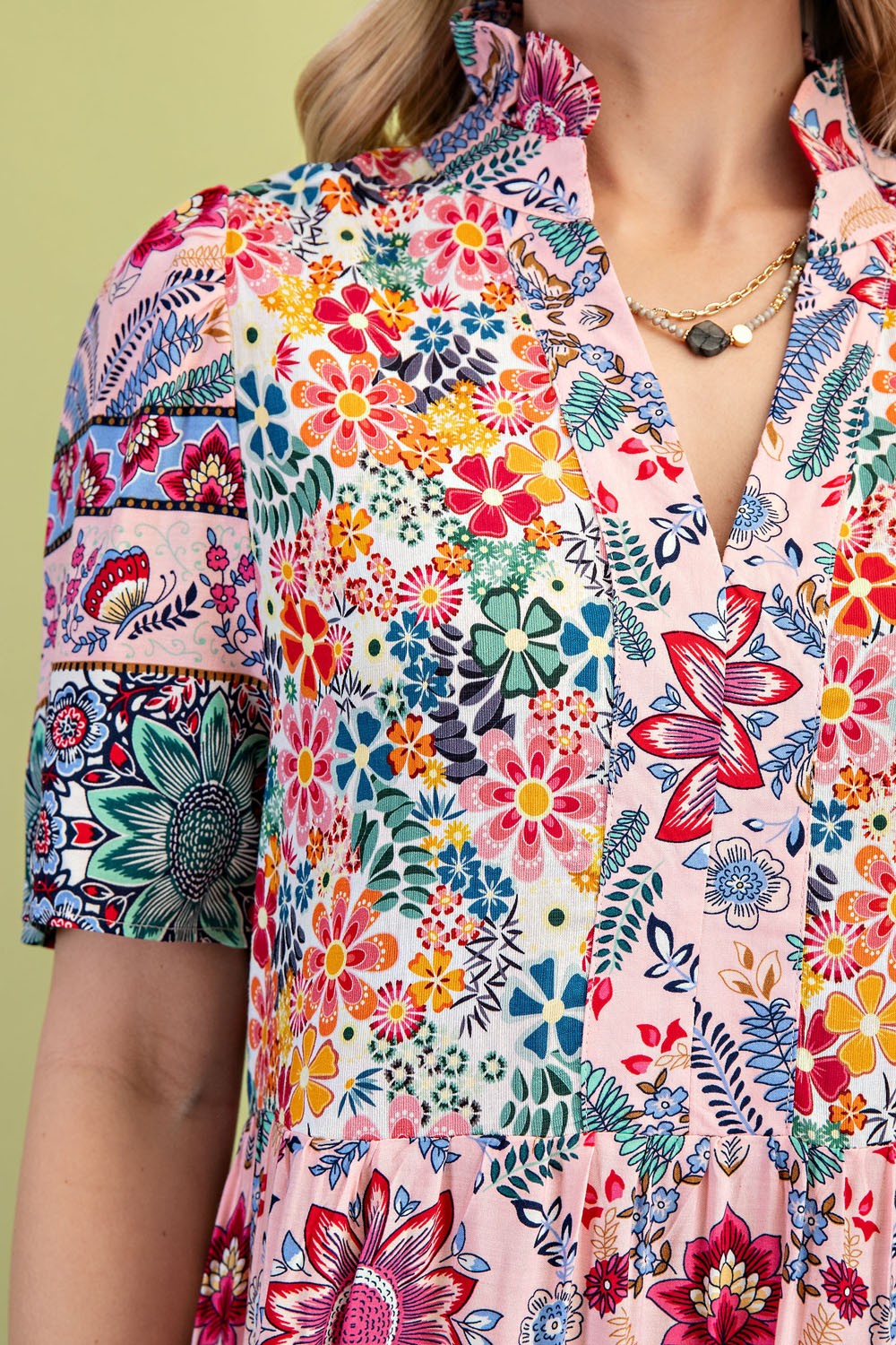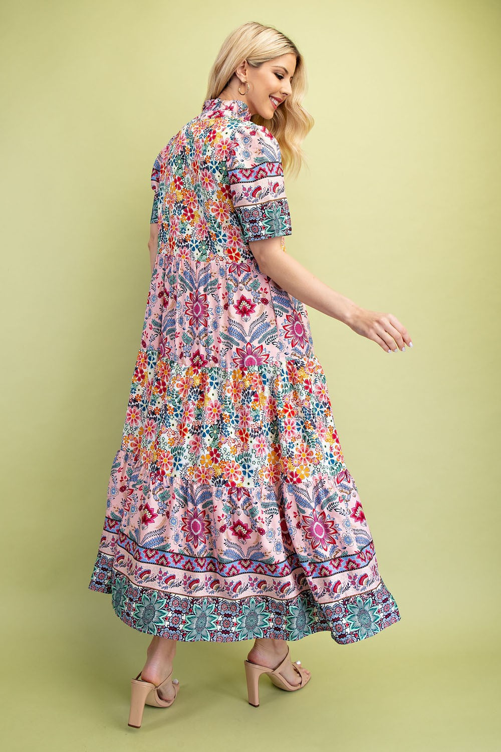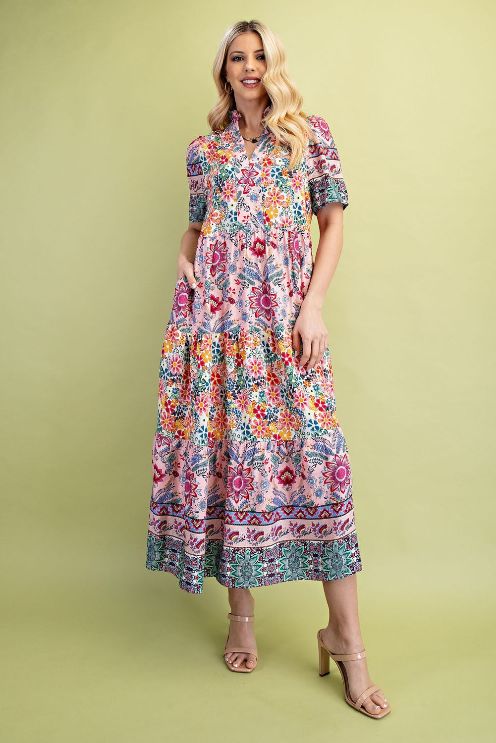 GiGio Mixed Print Tiered Midi Dress in Blush Mix