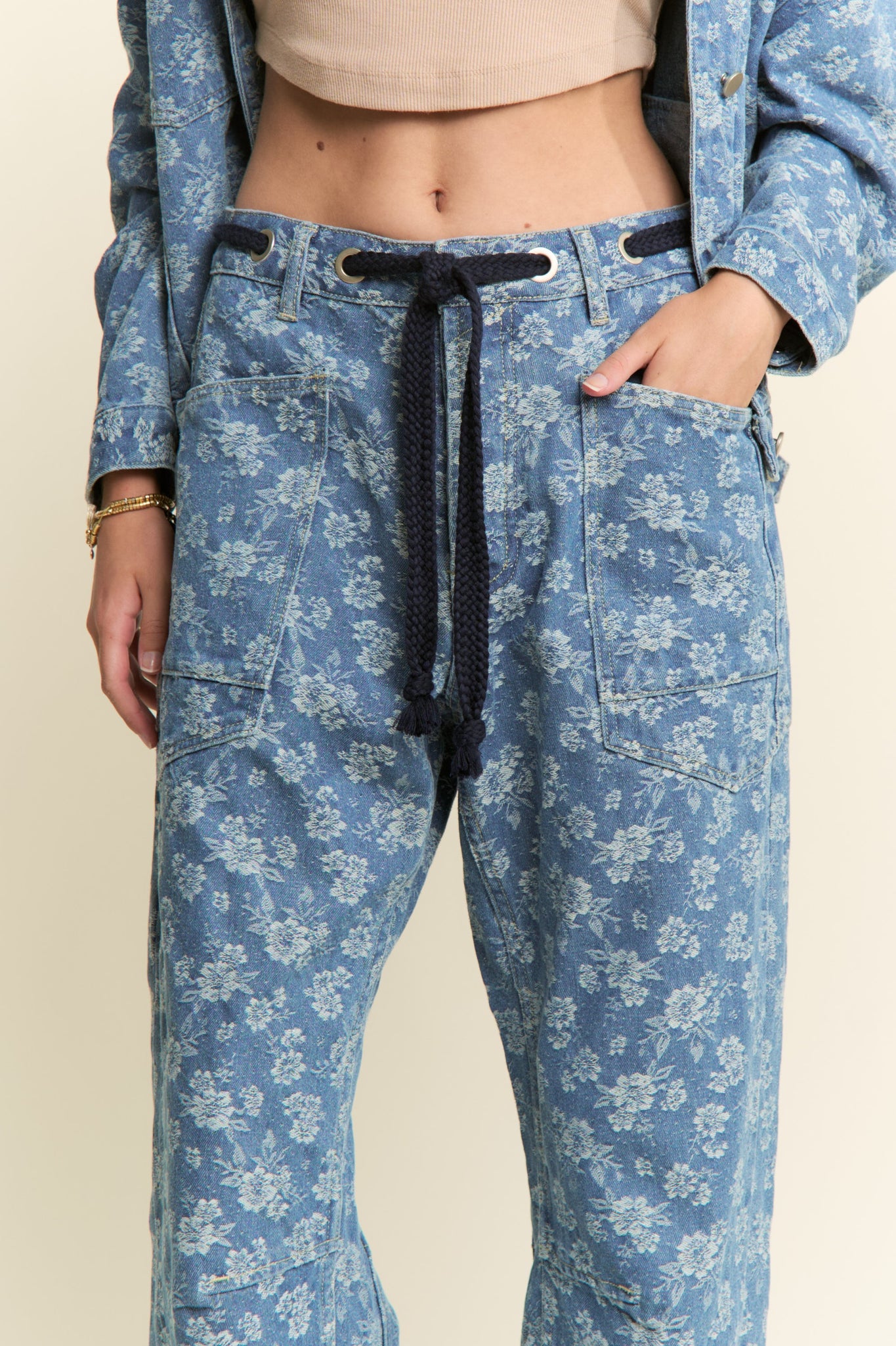 J.nna Floral Jacquard Denim Pants in Med Blue Denim