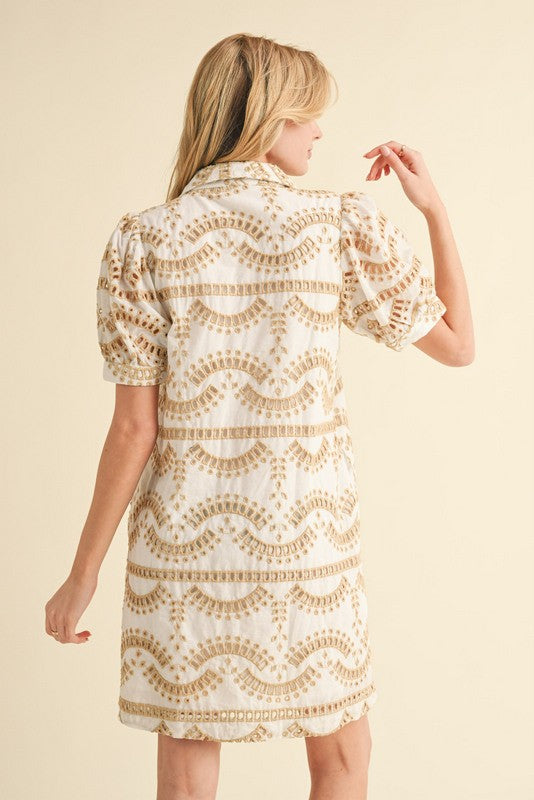 • Load image into Gallery viewer, Jodifl Geometric Print Eyelet Dress in Taupe