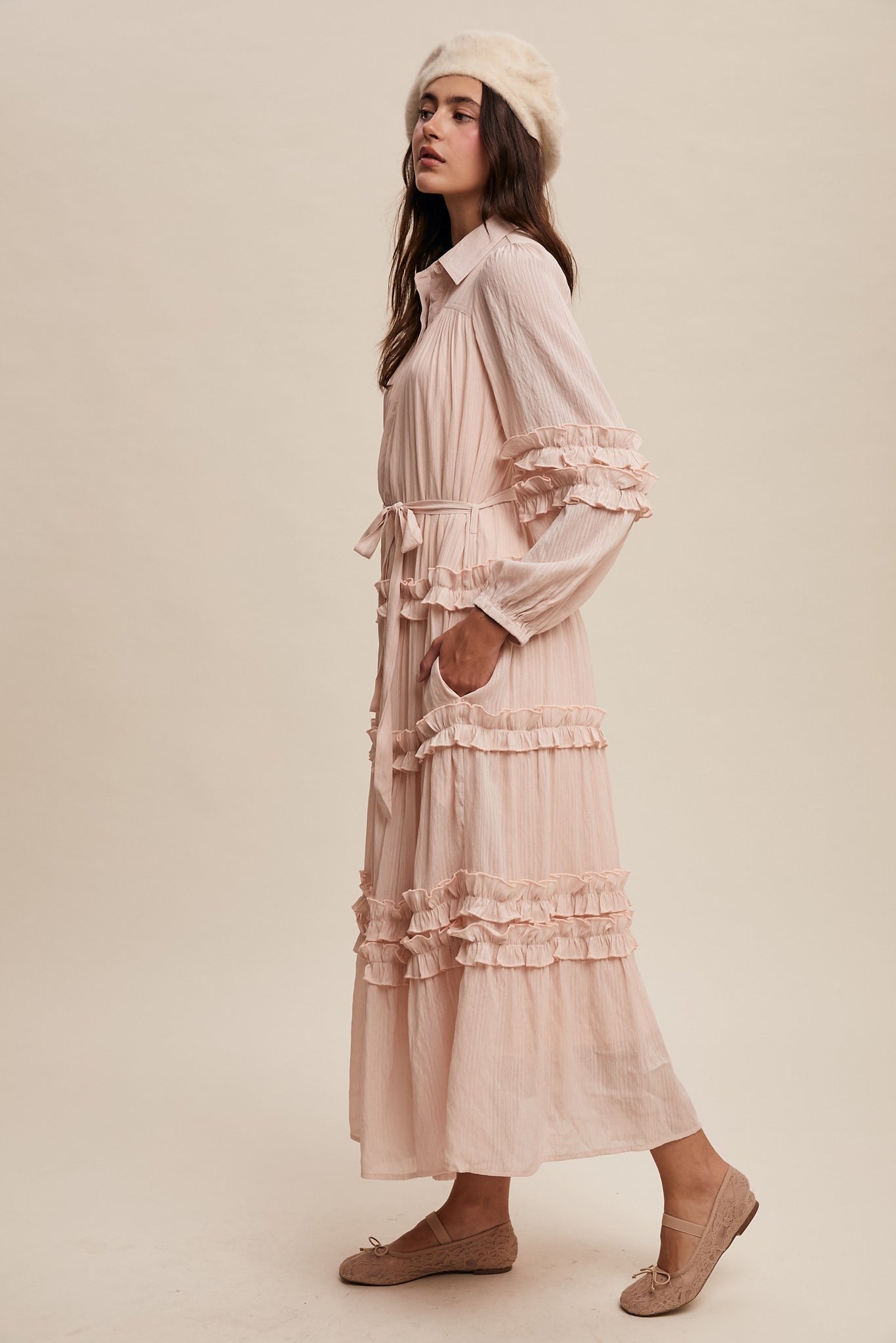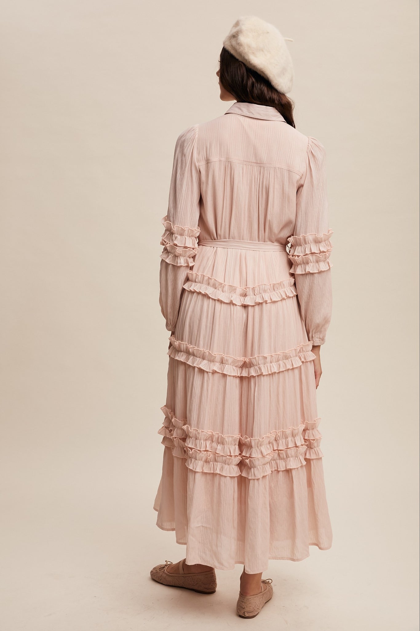 - Ruffle Accents on Sleeves and Skirt