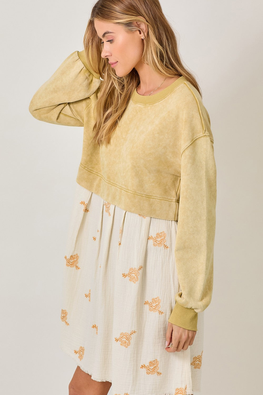Casual with a styled-together look, this twofer dress combines the ease of a sweatshirt with the detail of a skirt. The attached cropped sweater creates a layered effect on top, while the embroidered skirt adds a feminine touch with subtle texture. Designed in a thigh-length silhouette, it’s an easy, everyday piece that feels put together with minimal effort.