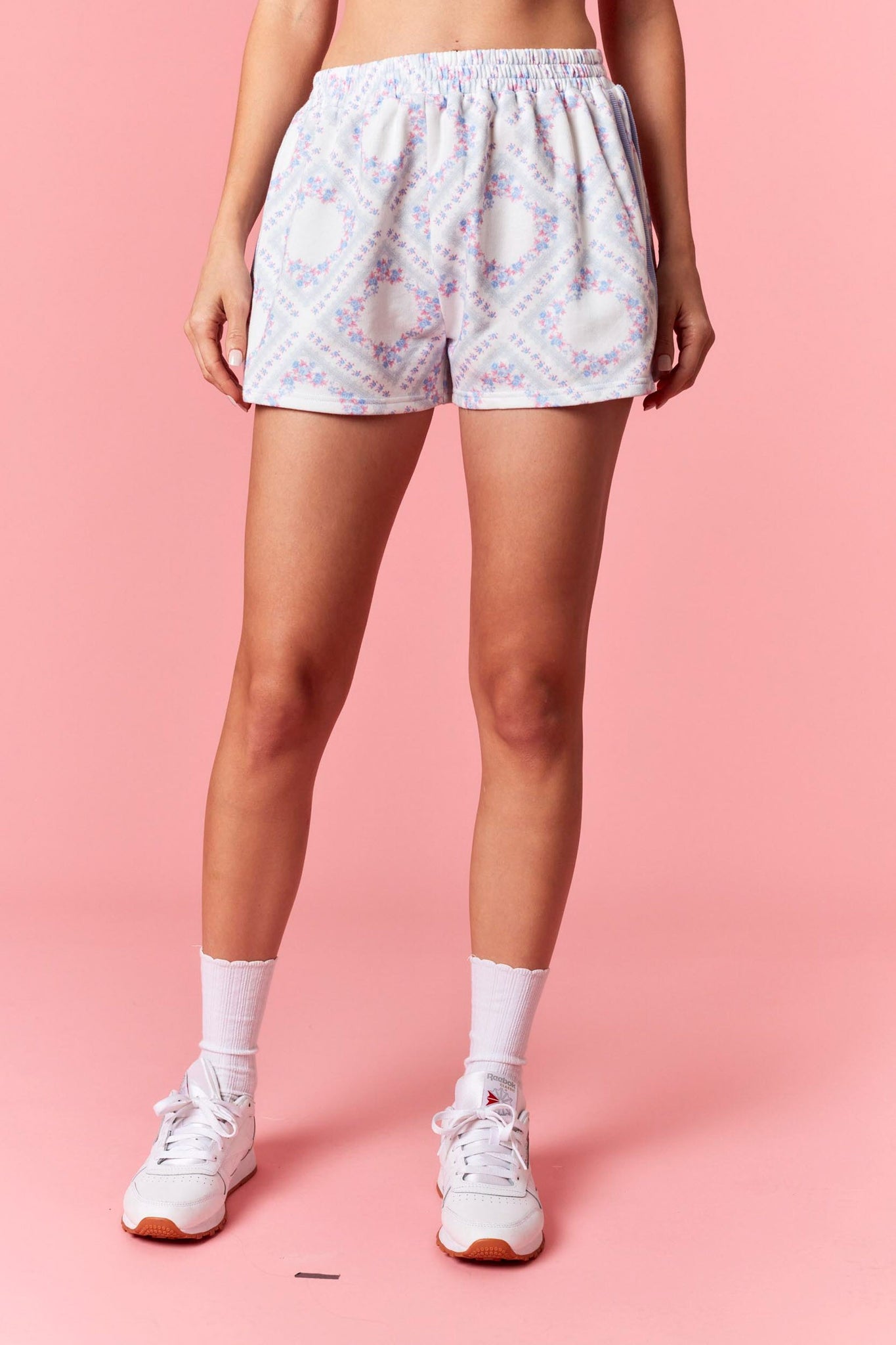 Peach Love Floral Scarf Print French Terry Shorts in Light Blue Multi