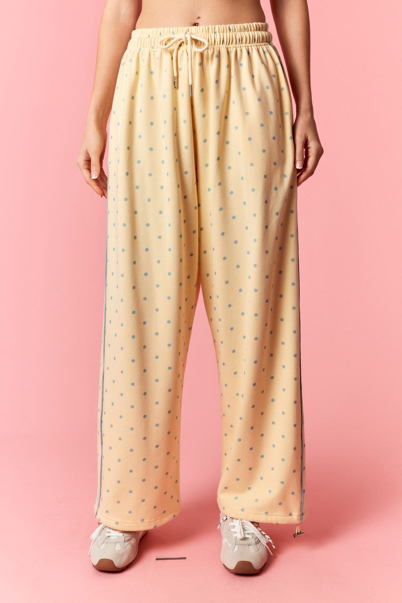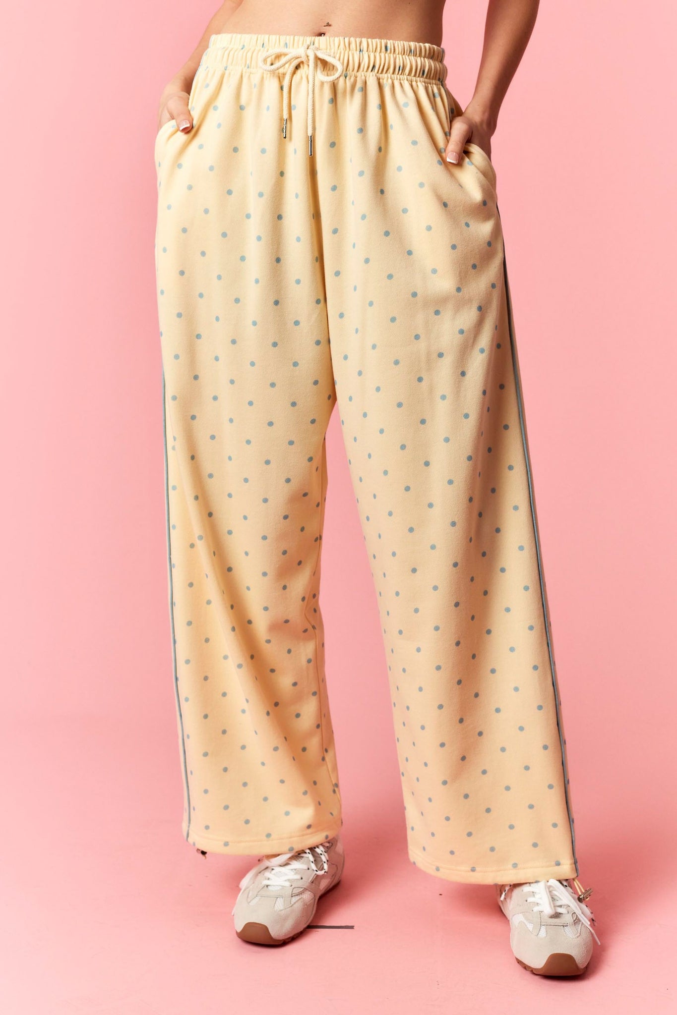 Laid-back with a hint of retro charm, these track pants feature a playful mini dot print paired with contrast piping for a vintage-inspired touch. Designed in soft French terry, they offer a comfortable feel that’s perfect for lounging or casual days out. The relaxed fit keeps things easy while still looking put-together.