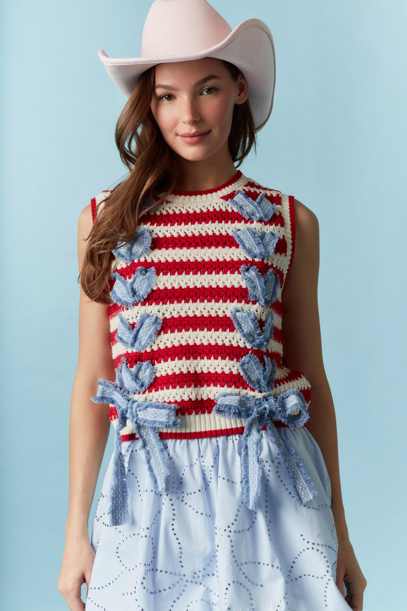 - Denim and Lace Strip of Fabric Weaved into Front and Tied in Bow