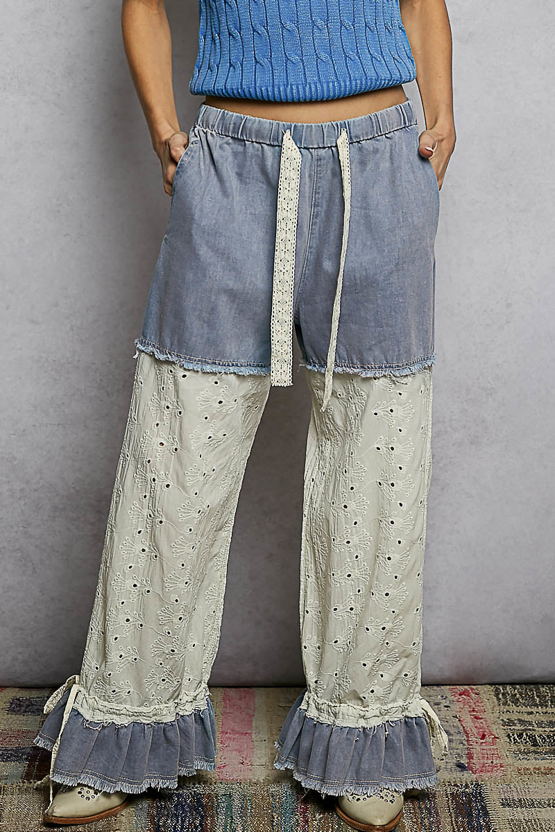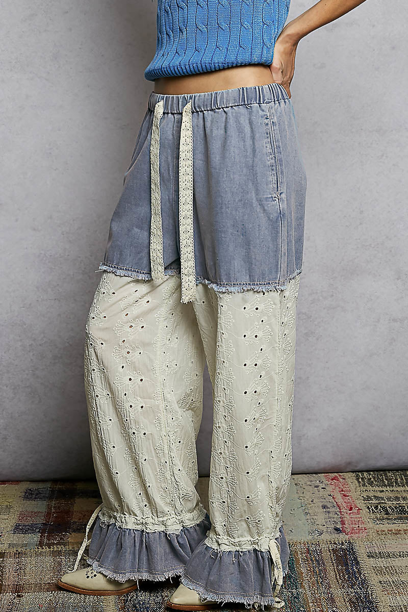 - Mixed Panels of Denim Twill and Eyelet Lace