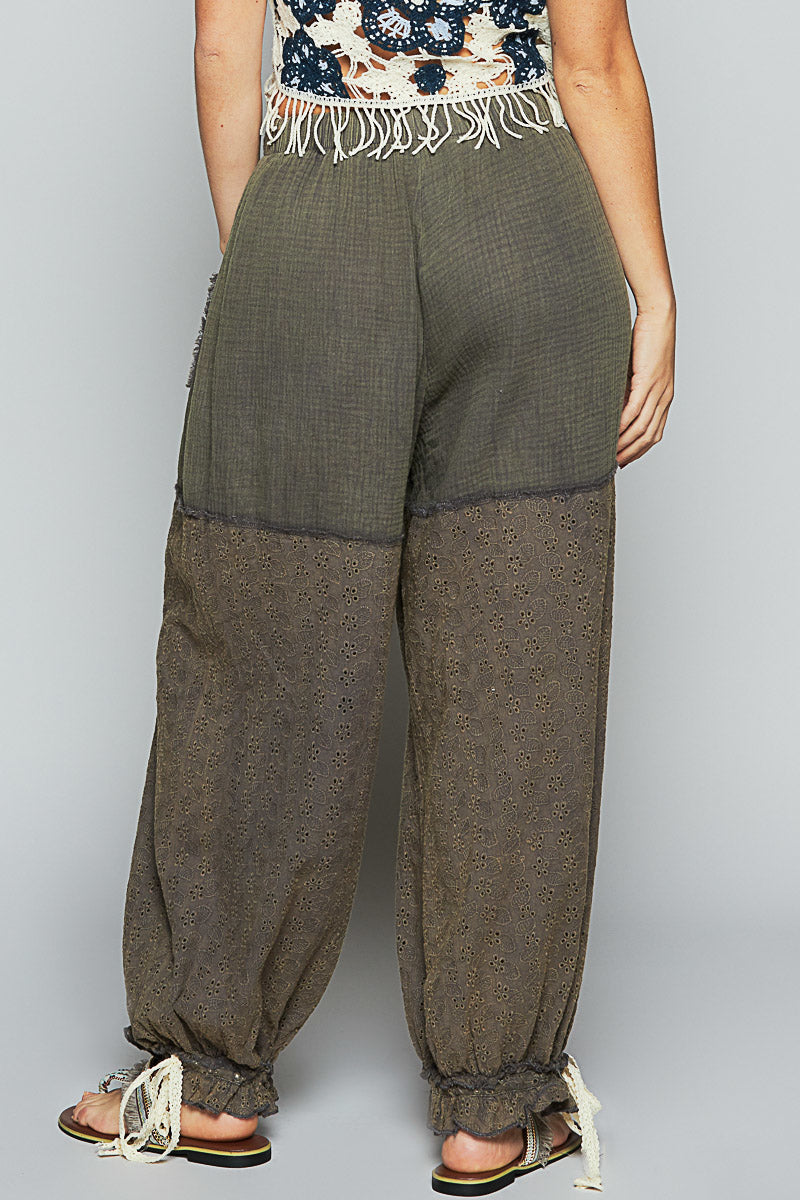 • Load image into Gallery viewer, POL Floral Eyelet Lace and Double Gauze Joggers in Charcoal