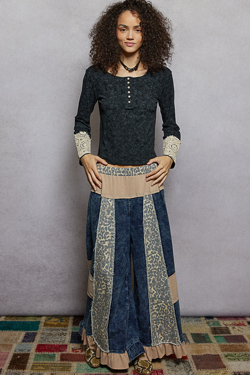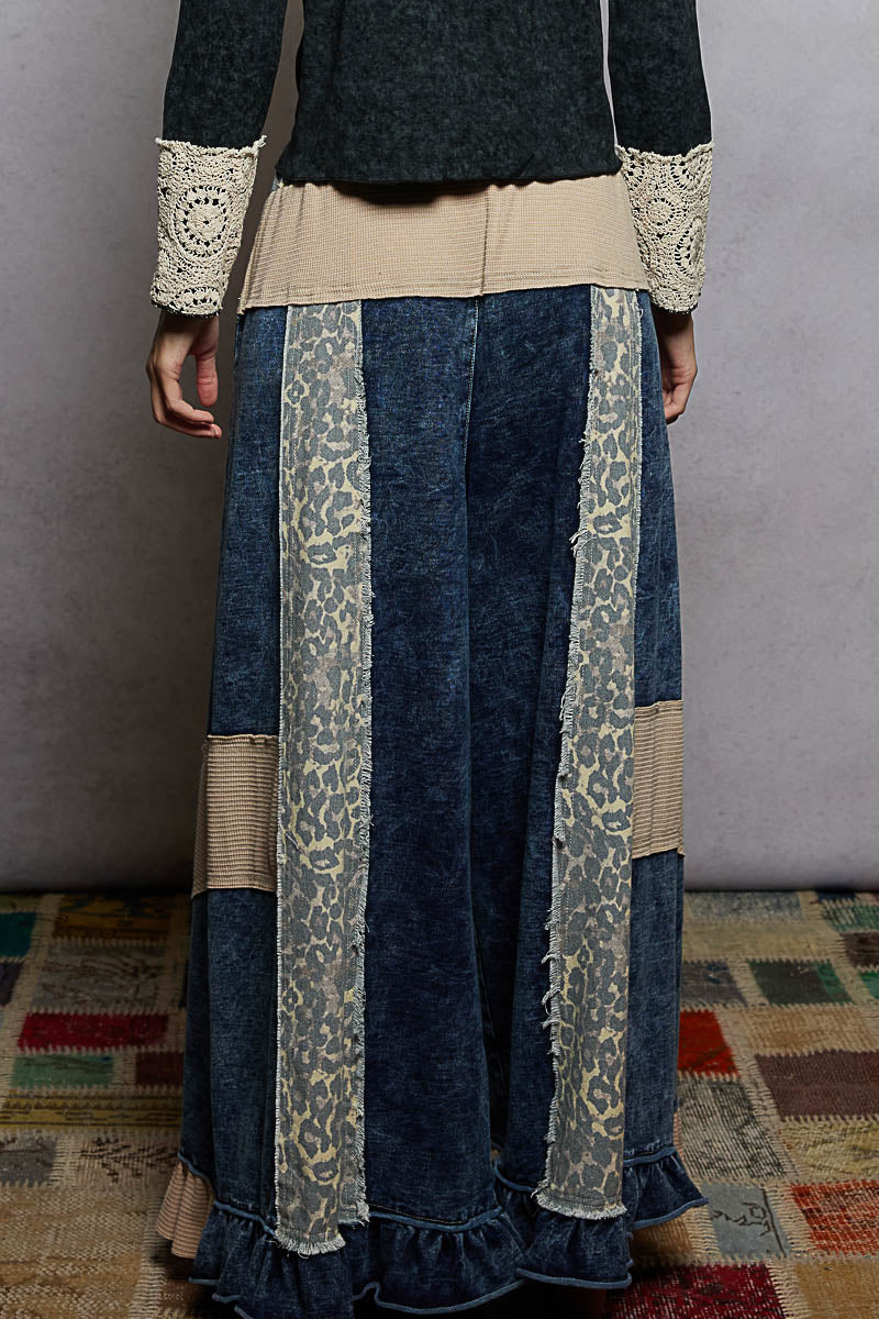 POL French Terry Patchwork Pants with Ruffle Hem in Indigo