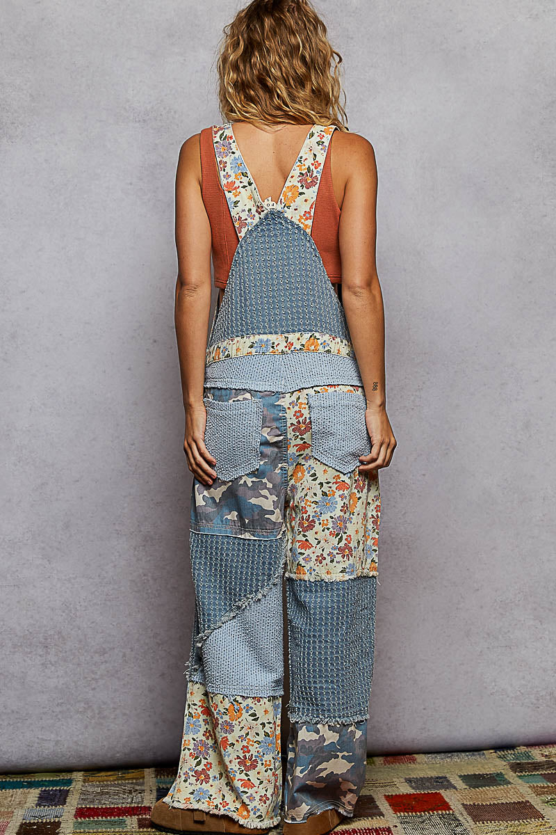 POL Mixed Print Patchwork Twill Overalls in Denim
