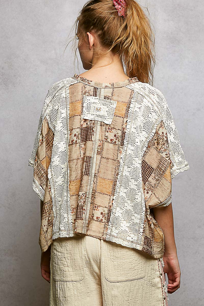 Upgrade your casual wardrobe with this v-neck short sleeve top featuring a boxy, relaxed fit for all-day comfort. Designed with vintage washed fabric for a worn-in, soft feel, this top showcases a unique patchwork pattern with delicate lace and crochet patch details. The front pocket adds both style and practicality, making it perfect for layering or wearing on its own.