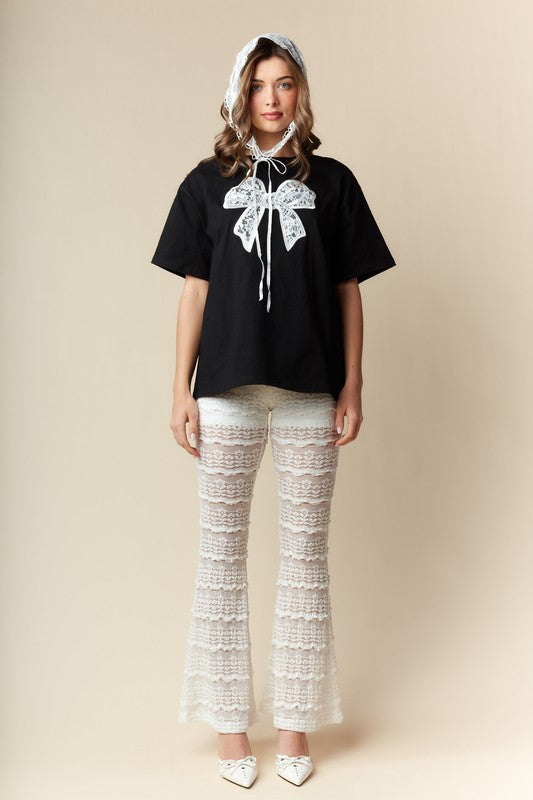 RARERAW OVERSIZED T-Shirt with Embroidered Lace Bow on Front in Black
