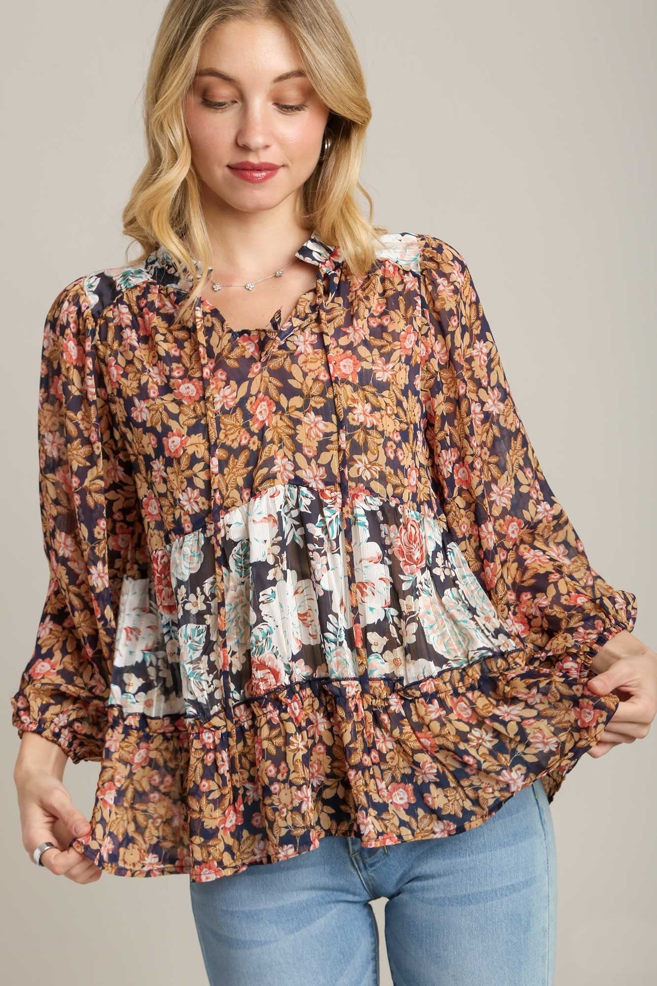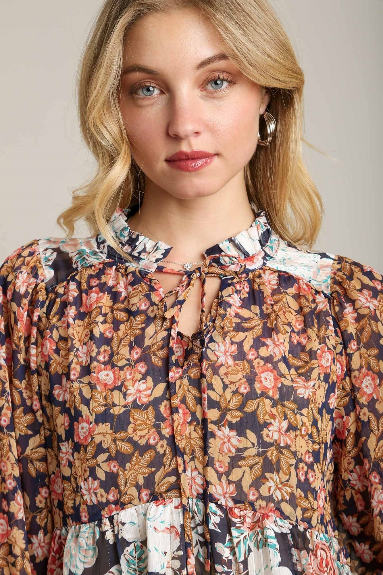 This Umgee A-Line Mixed Floral Print Top is stylish and eye-catching. Featuring a ruffled V-neck with neck ties, long puff sleeves and metallic thread details, this top is perfect for a special occasion. The tiered design and floral print will make sure you stand out in any crowd.