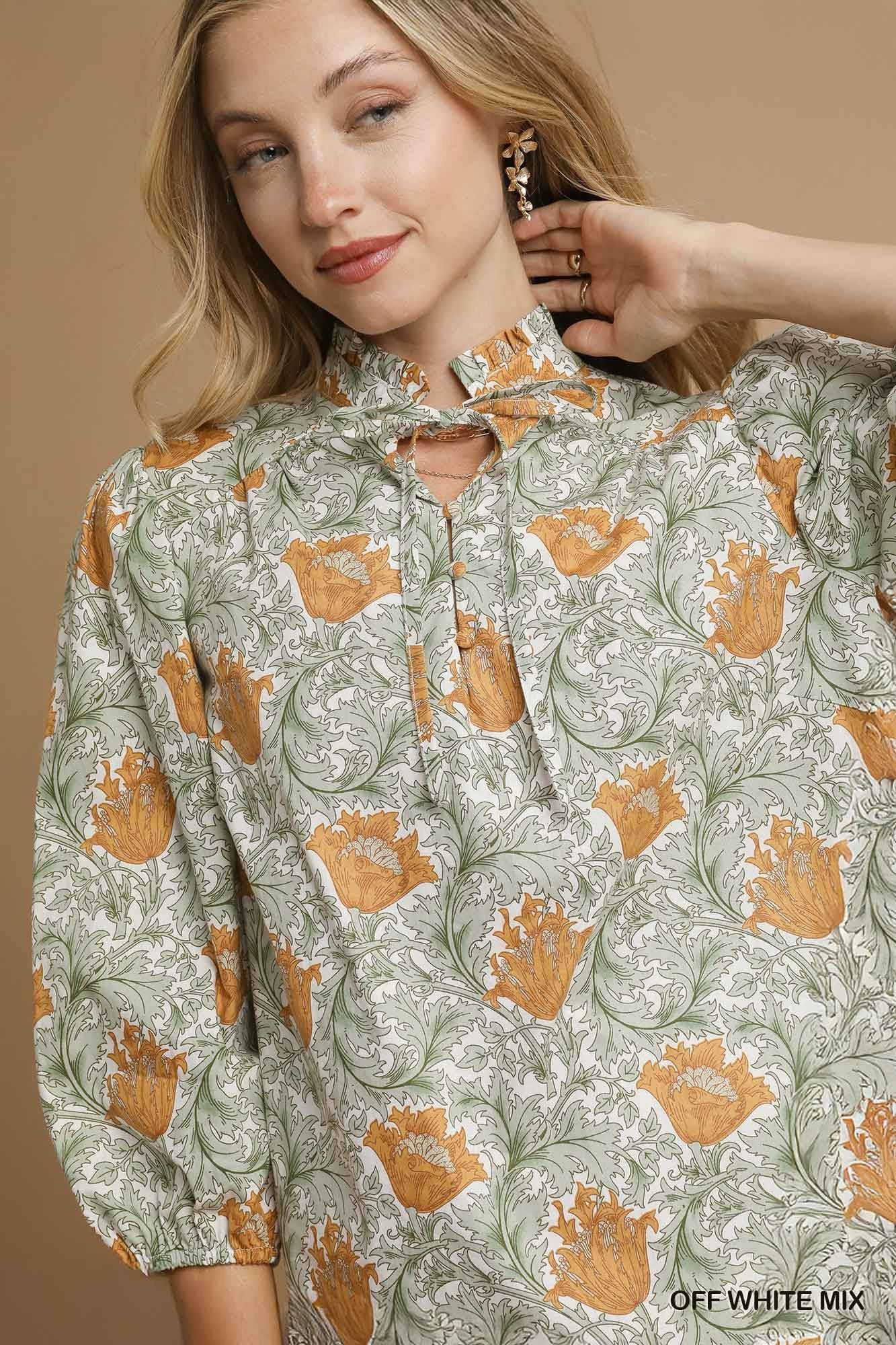 Umgee Abstract Print Puff Sleeve Blouse in Off White Mix