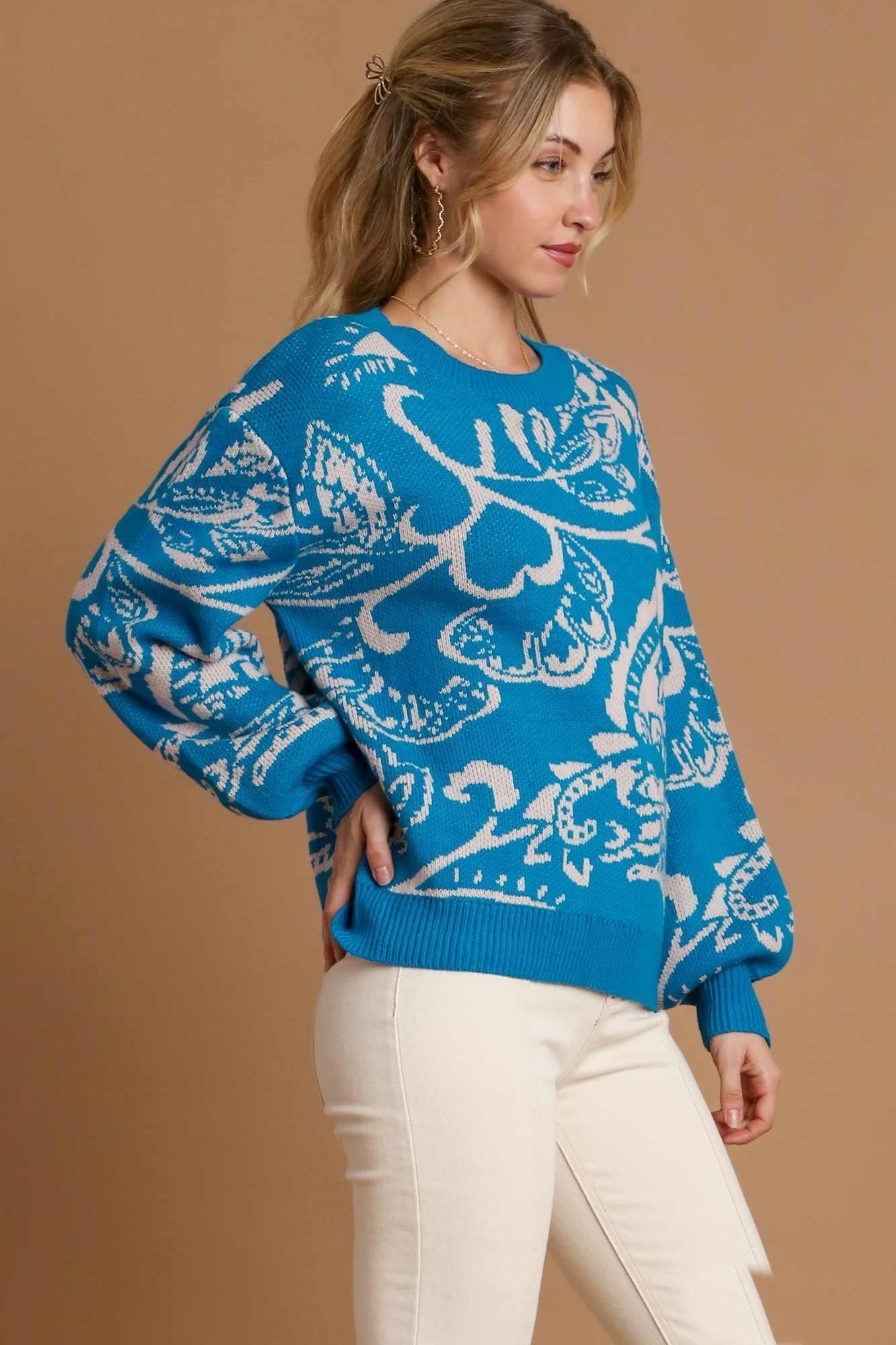 • Load image into Gallery viewer, Umgee Floral Knit Sweater in Turquoise