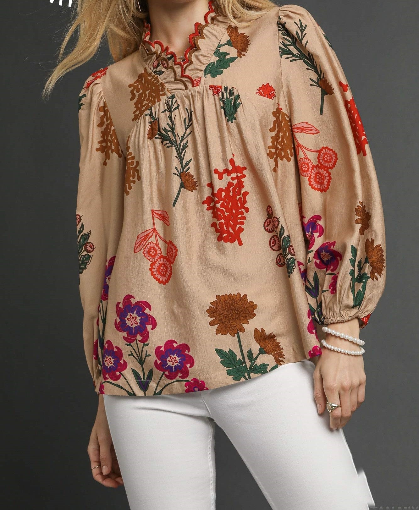 Umgee Flower Print Top with Scalloped Details in Tan Mix