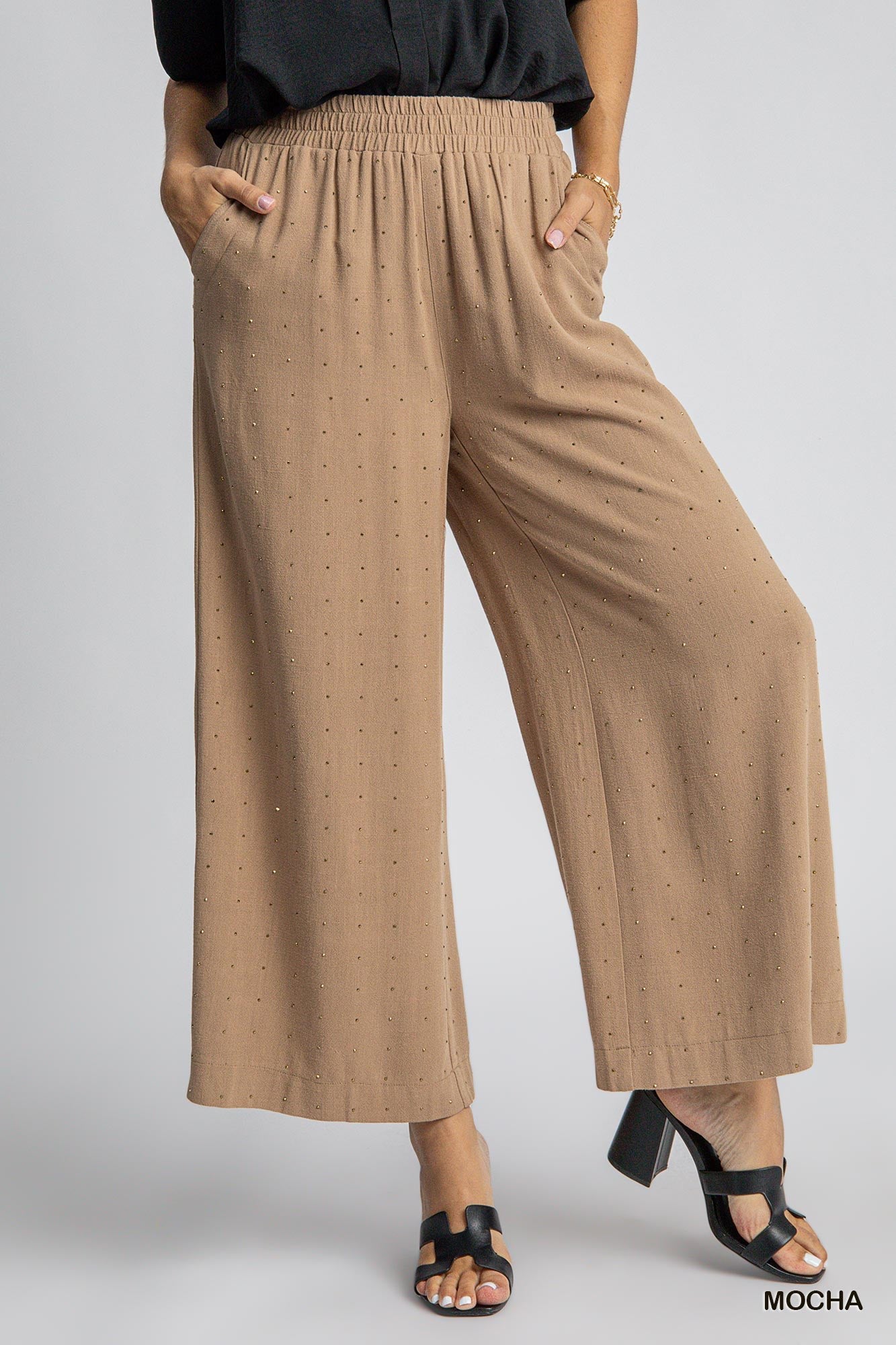 Umgee High Waisted Embellished Linen Pants in Mocha