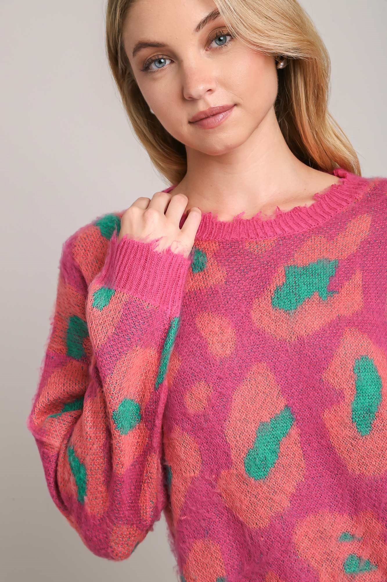 Leopard Sweater With Destroyed Rib Band Pullover Sweater