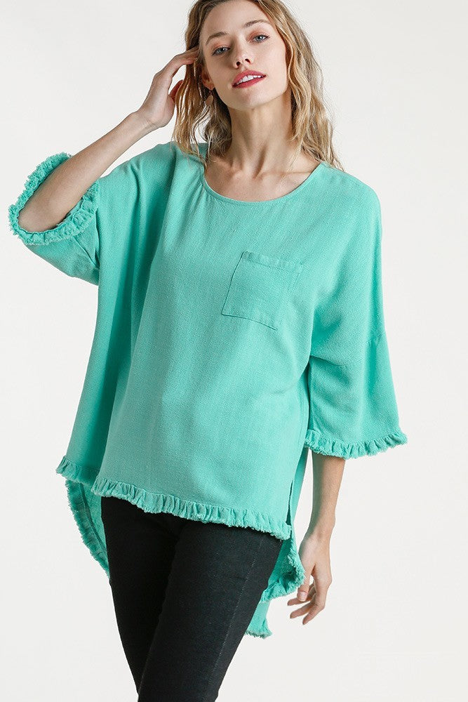 Linen top by Umgee featuring a front chest pocket, frayed hemline, round neckline, and scoop hem.