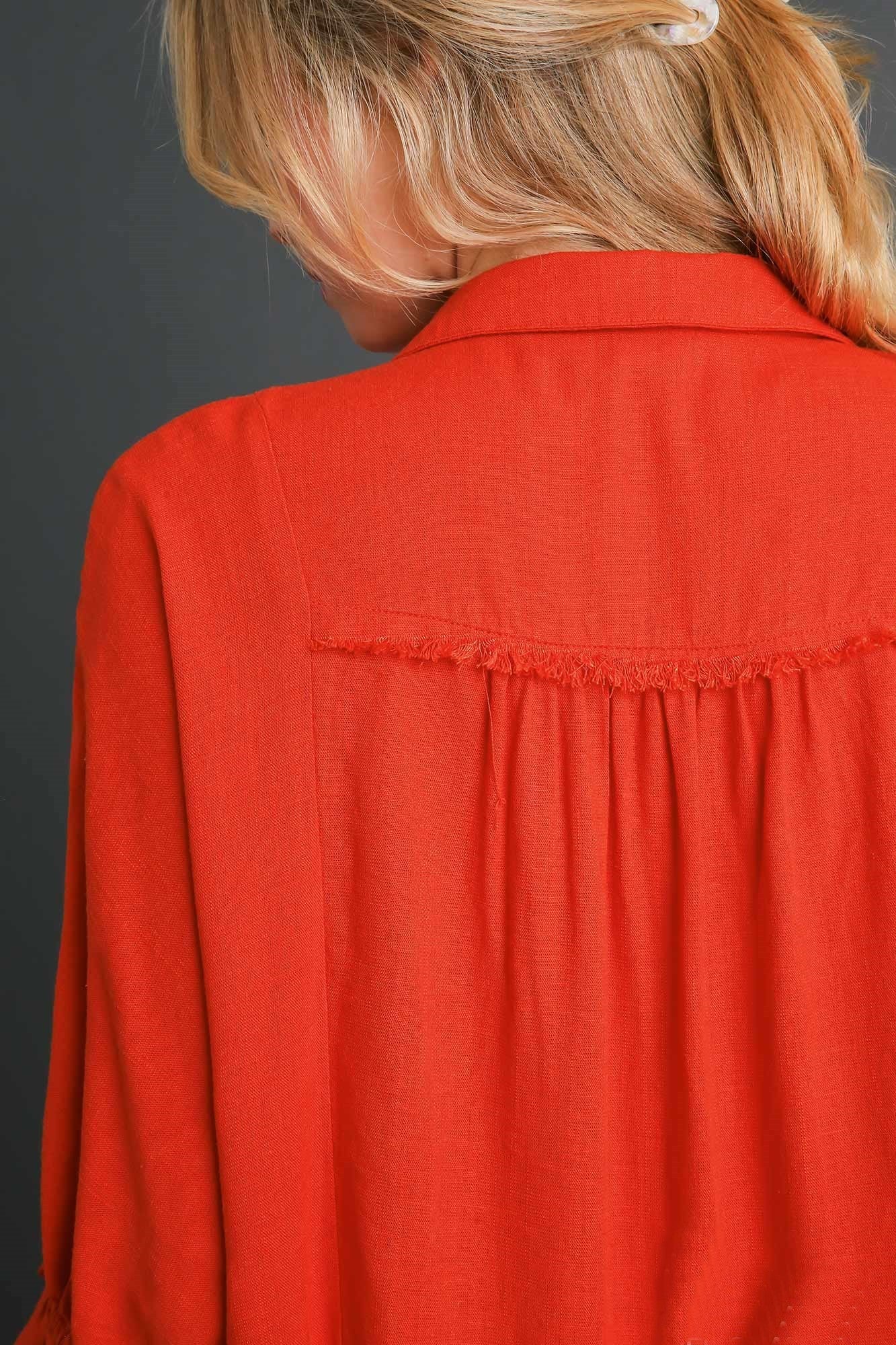Umgee Linen Blend Top with Half Button Detail and Frayed Hemline in Red Orange