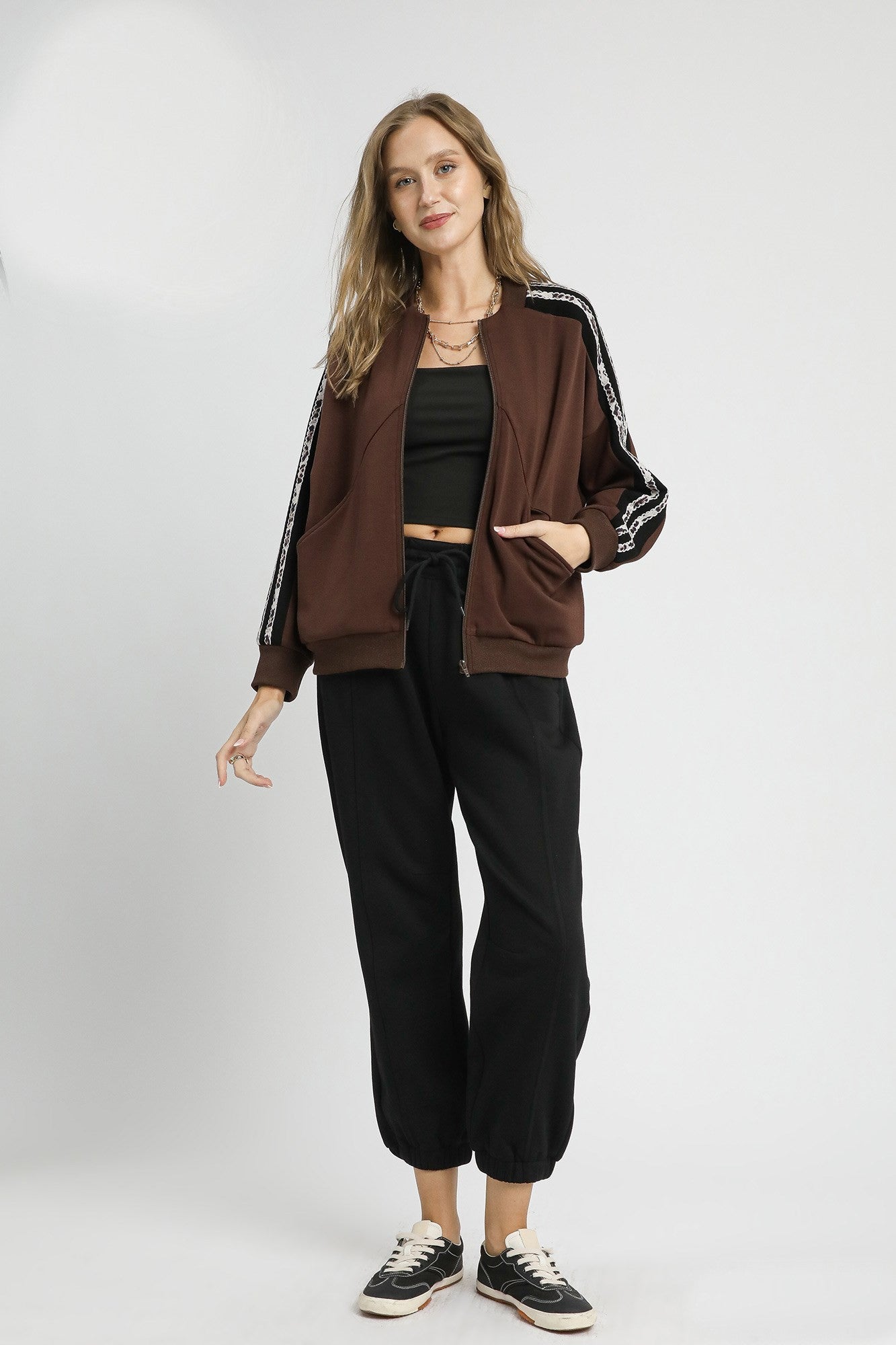 Umgee Luxeknit Jacket with Contrasting Stripe Sleeves in Chocolate