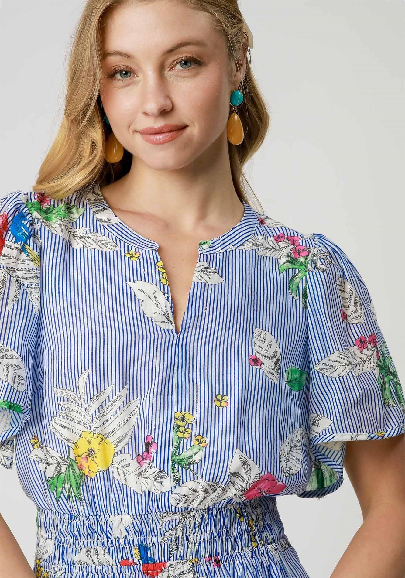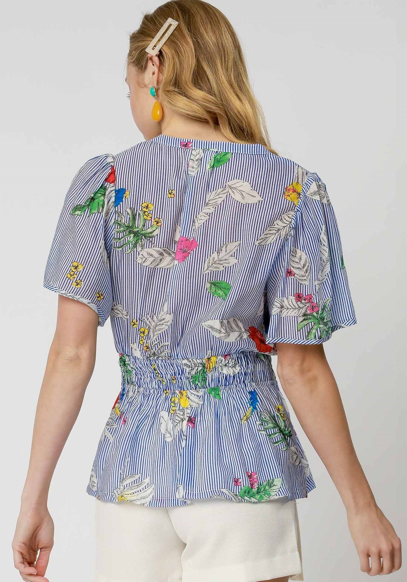 Umgee Mix Floral Striped Peplum Blouse in Blue Mix