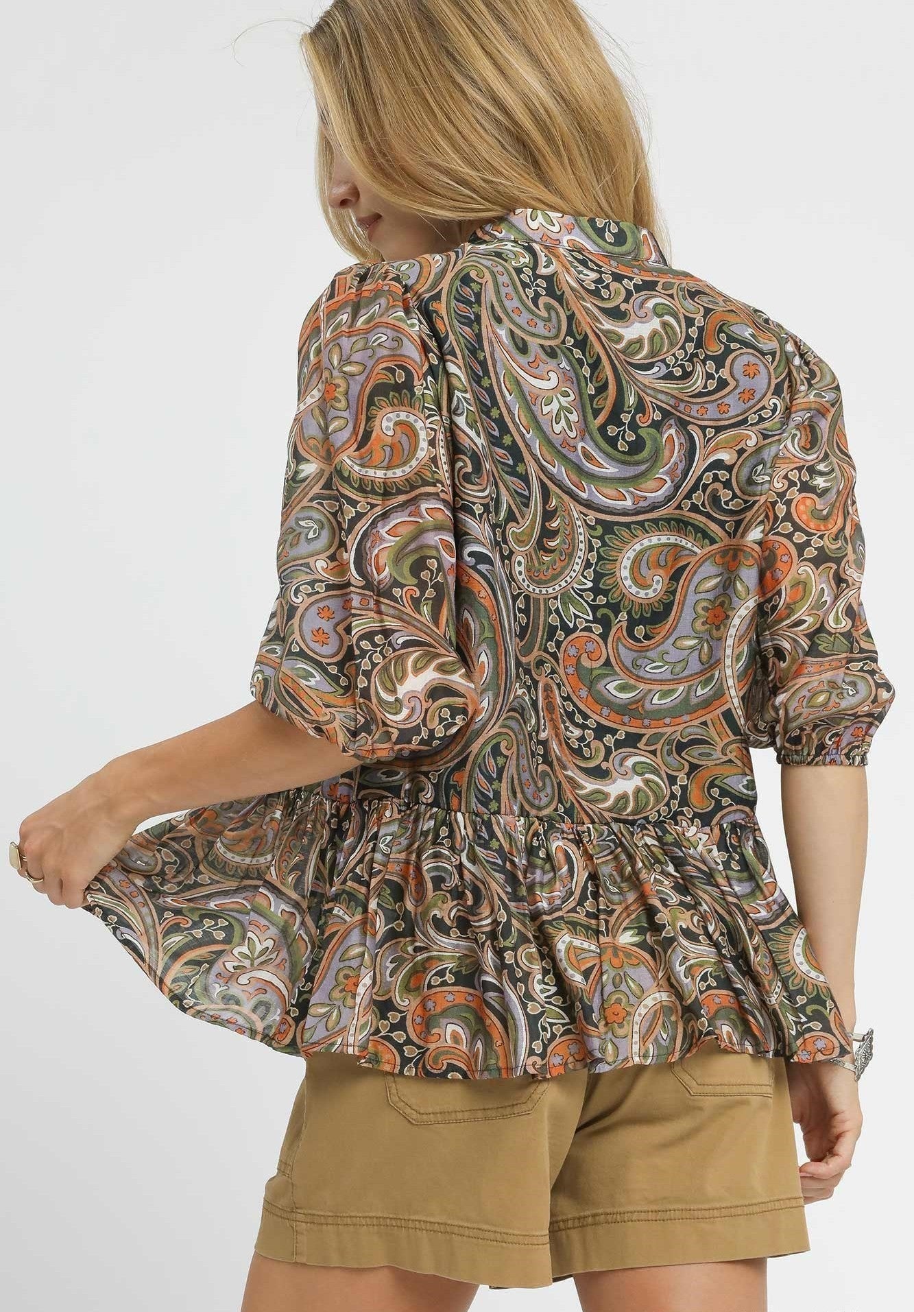 • Load image into Gallery viewer, Umgee Paisley Print Peplum Top in Green/Orange