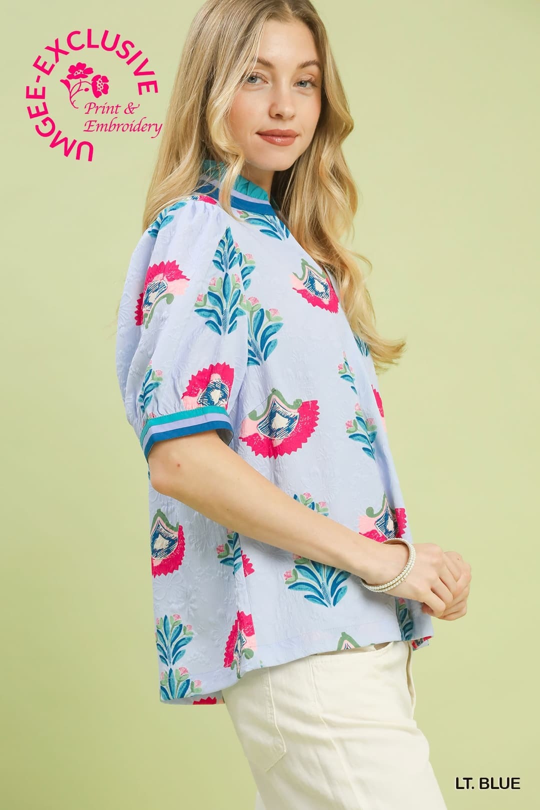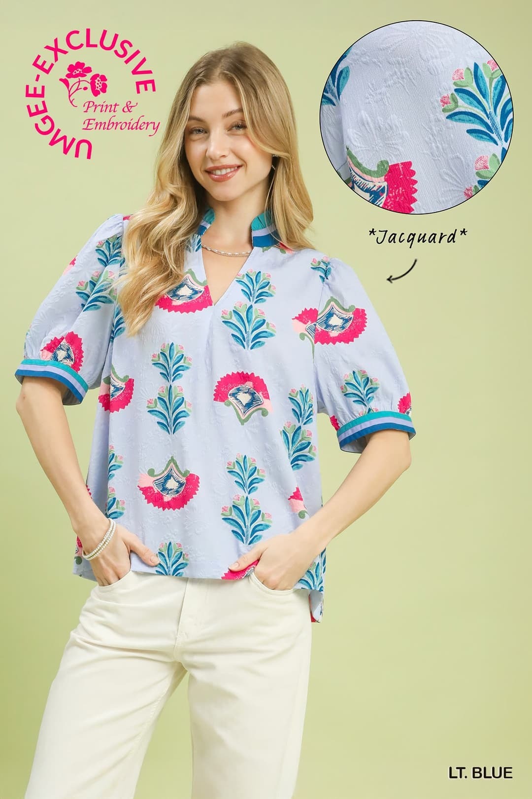 This abstract jacquard top stands out with its unique texture and eye-catching colorblock contrast. Designed with a split V-neckline, it offers a flattering, easy fit, while the short puff sleeves add a soft, feminine touch.