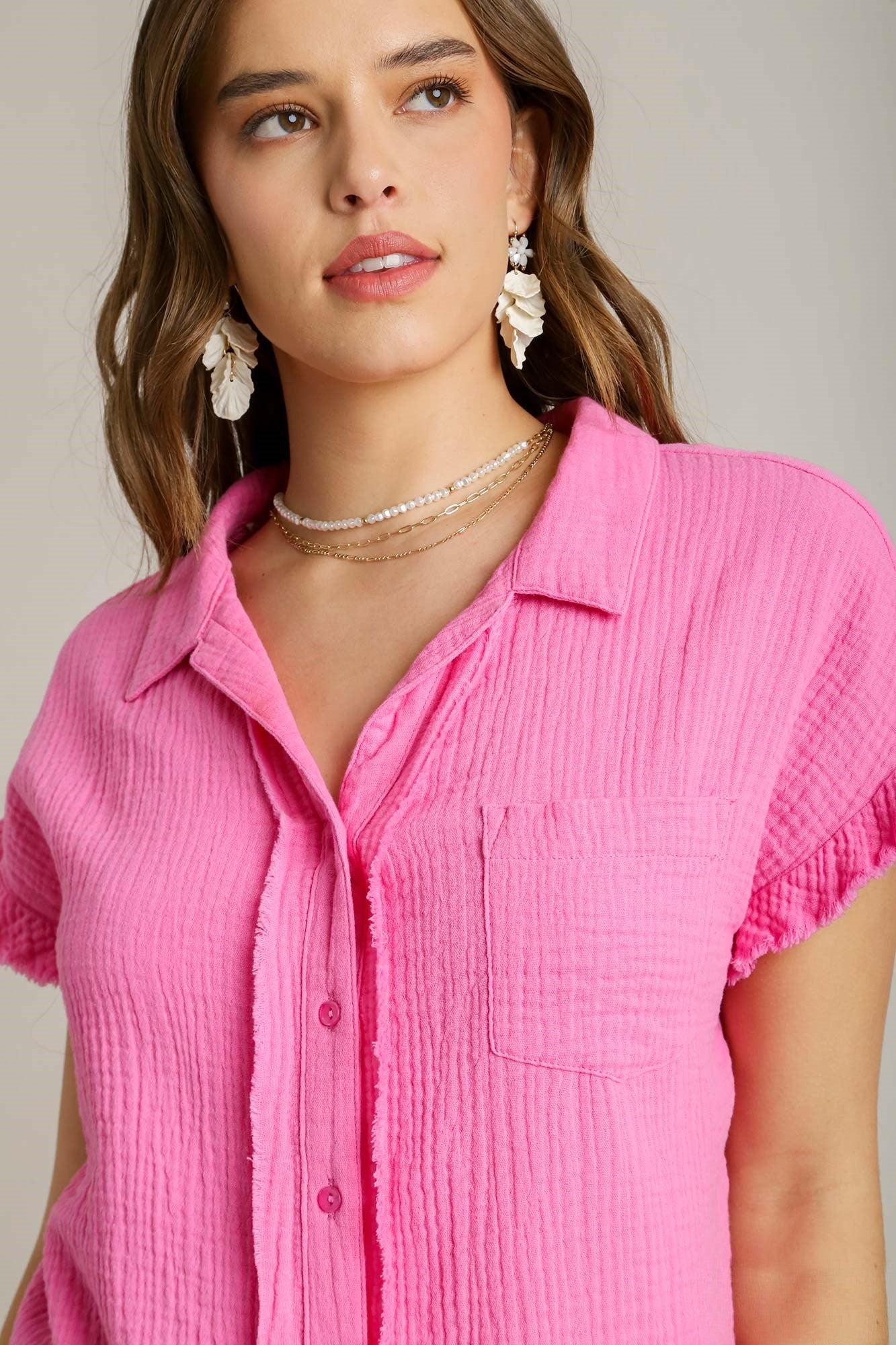 Umgee Short Sleeve Collared Button Up Top with Frayed Hem in Bubblegum