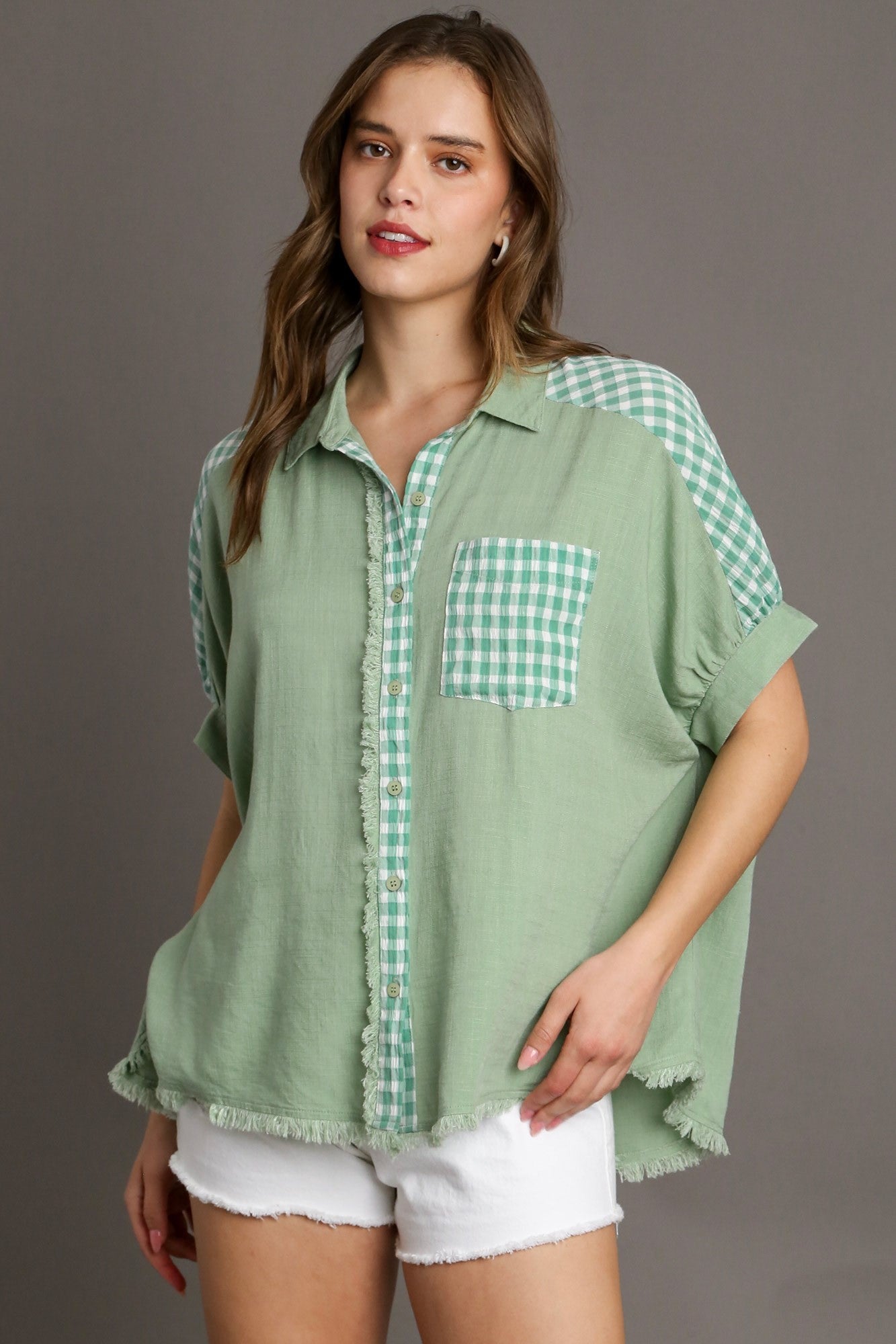 Solid Boxy Cut Linen Blend Checkered Button Down Collared Shirt with Fray Details