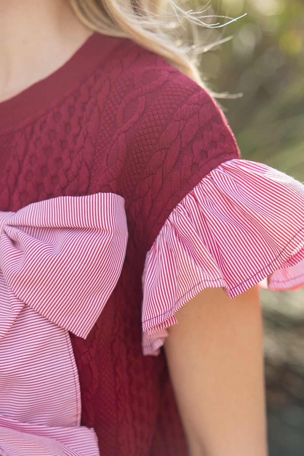 - Contrasting Striped Sleeves and Large Ribbon Bow Front
